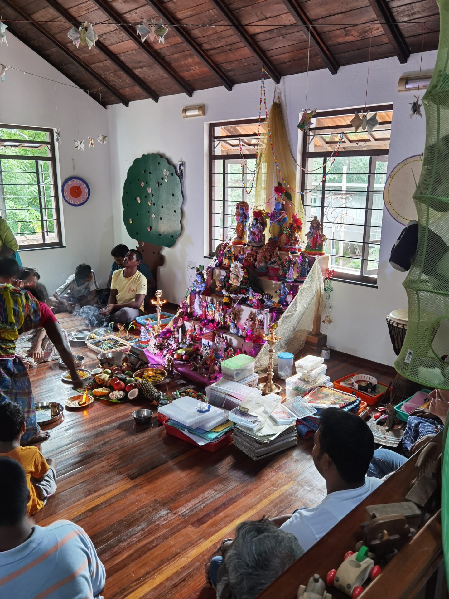 Ich war heute an einem Ort für Dorfkinder mit speziellen Bedürfnissen (Deepam). Jemand aus dem Gästehaus hier hatte mich eingeladen, sie zu begleiten. Es war eine Art Zeremonie im Rahmen von Navarathri zu Ehren der Göttin Saraswathi – sie steht für Bildung, Wohlstand und Erfolg. In Indien wurden heute die Gegenstände, die man zum Arbeiten benötigt, gereinigt und geweiht, als eine Art des Danks. Ihnen wurden Gaben gebracht und es wurde gesungen. In dem Therapiezentrum waren das neben Figuren, Büchern und anderen Spielsachen auch die Buchhaltungsbücher mit der Spendenkartei. In einer zweiten Etappe dann der Schulbus. Er fuhr über Zitronen und Kürbisse wurden auf der Straße zerschlagen.